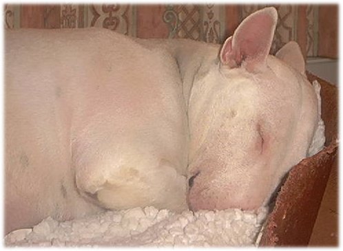 Rosie was my foundation bitch, she is behind most of the dogs I have at Activior she was lightly shown at open shows and had many Best Of Breeds and Best Puppies .She lived 6 happy years with my mum who wouldnt let me take her when I flew the nest.They enjoyed walking and a good friendship, and Rosie was a best friend to both my mum and me. Unfortunately Rosie died in Nov 2001 after a infection to her bladder worsened, she died very peacefully at home surrounded by those who loved her, (and still do). A true bull terrier- a wonderful friend, mother and companion.